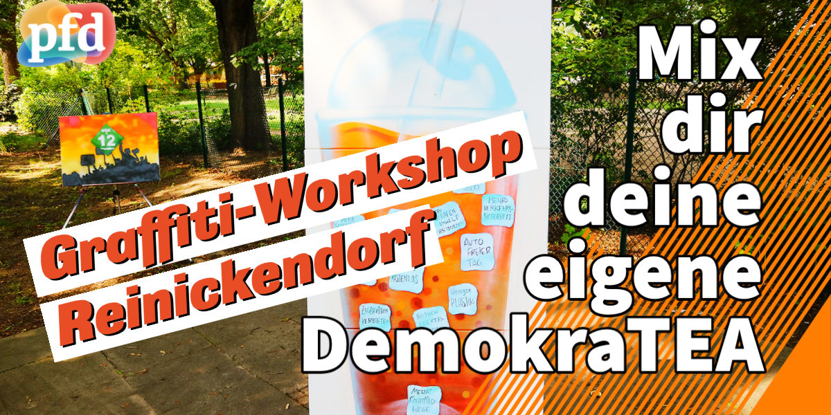 „Stell dir vor, du kannst dir deine Nachbarschaft, deine Schule, deine Stadt… so zusammenstellen, wie einen Ice-Tea.“ Mit diesem Satz hat die Partnerschaft für Demokratie (PfD) im Sommer 2021 junge Menschen ab 11 Jahren auf einem Flyer angesprochen. Konkret ging es um einen Sommerferien Graffiti-Workshop mit dem Titel „Mix dir deine eigene Demokra-Tea“.