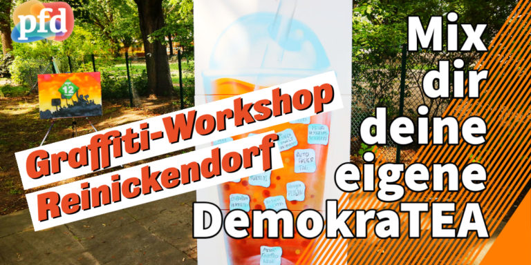 Demokratie für junge Menschen in Reinickendorf erlebbar machen „Stell dir vor, du kannst dir deine Nachbarschaft, deine Schule, deine Stadt… so zusammenstellen, wie einen Ice-Tea.“ Mit diesem Satz hat die Partnerschaft für Demokratie (PfD) im Sommer 2021 junge Menschen ab 11 Jahren auf einem Flyer angesprochen. Konkret ging es um einen Sommerferien Graffiti-Workshop mit dem…