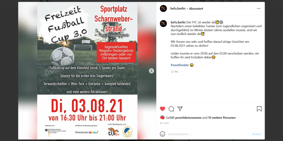Zum Berliner Ferienbeginn, veranstalteten die jungen Partizipationslotsen der Beteiligungsfüchse zusammen mit dem Team der 2. E-Jugend des FC-Liberta ein spannendes Fußball-Tranings-Camp auf dem Zeltlagerplatz ZEV in Heiligensee. Die jungen Fußballer berichteten begeistert davon, wie sie zum ersten Mal ein Zelt selbst aufgebaut hatten, unermüdlich Feuerholz sammelten und sogar ganz demokratisch einen Teamrat eingerichtet hatten… Mehr…