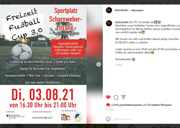 Zum Berliner Ferienbeginn, veranstalteten die jungen Partizipationslotsen der Beteiligungsfüchse zusammen mit dem Team der 2. E-Jugend des FC-Liberta ein spannendes Fußball-Tranings-Camp auf dem Zeltlagerplatz ZEV in Heiligensee. Die jungen Fußballer berichteten begeistert davon, wie sie zum ersten Mal ein Zelt selbst aufgebaut hatten, unermüdlich Feuerholz sammelten und sogar ganz demokratisch einen Teamrat eingerichtet hatten… Mehr…